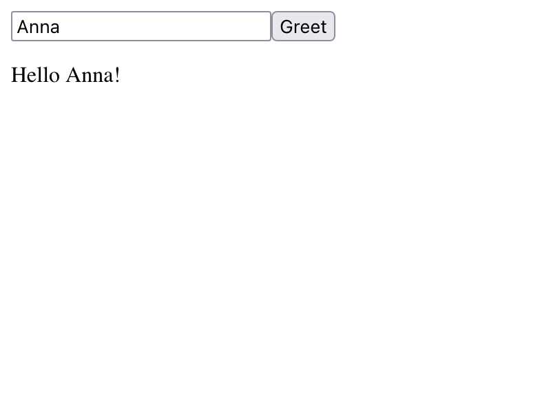 }Msg is a custom type — each variant represents one thing that can happen. UserUpdatedName carries the current input value, dispatched on every keystroke via on_input. UserClickedGreet carries no data; it's dispatched when the button is clicked.